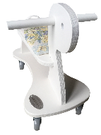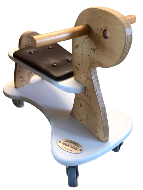 Een blank houten fietsje, met whitewash voeten-plankje welke is bewerkt met blank houten bloemdetail. Het zadel zelf is gemeleerd grijs met daarop een prachtig abstract bloemdetail van goud lint.